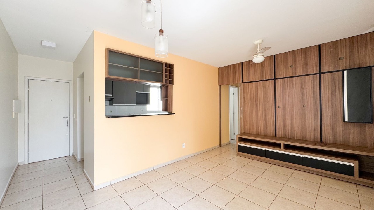 O apartamento fica no 4º andar e possui 70m² de área privativa, sala ampla com dois ambientes, painel de tv e sacada, cozinha com armário planejado, área de serviço, banheiro social, 2 quartos sendo 1 suíte.