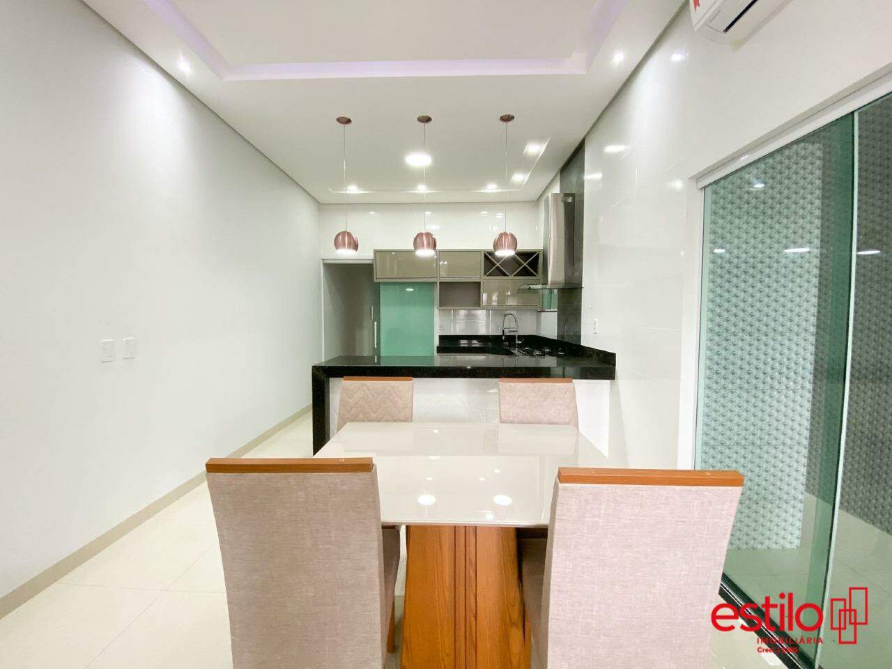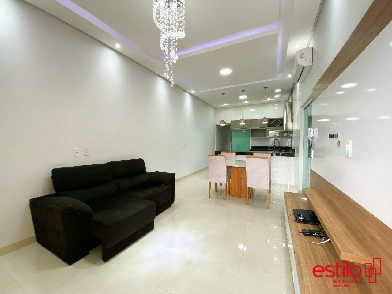 A parte interna deste imóvel possui uma sala ampla com dois ambientes, sala de estar já equipada com sofá e painel de tv e sala de jantar com mesa com 4 cadeiras e cozinha equipada com armários planejados, geladeira e fogão cooktop.