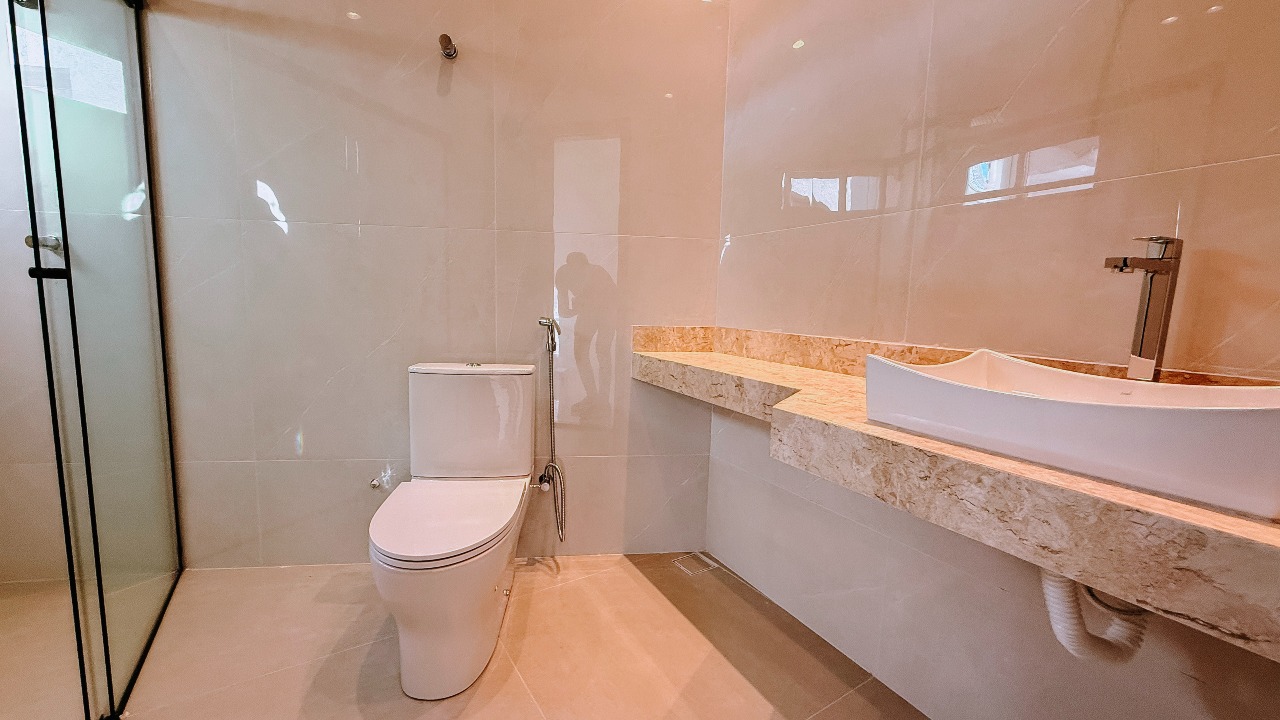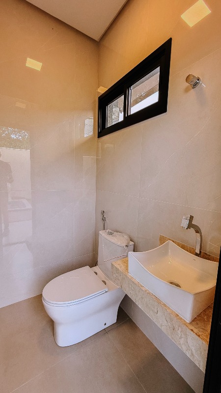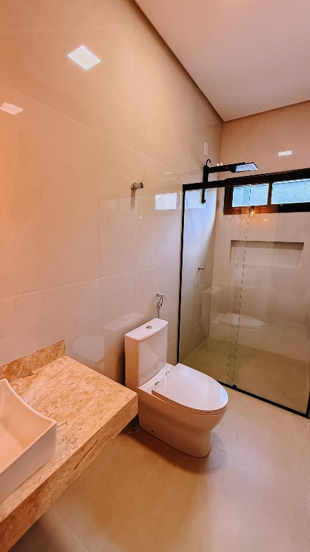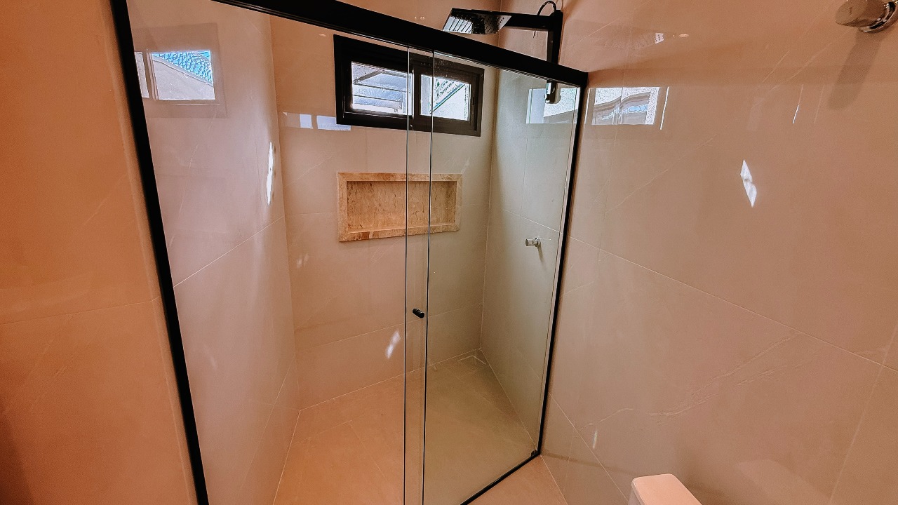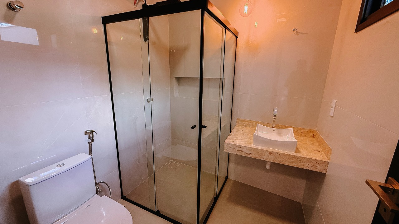A casa oferece garagem coberta para 02 veículos, janelas em esquadrias de alumínio, banheiros com box e duchas instalados, além de um projeto que prioriza segurança, com cerca elétrica com concertina e portão eletrônico com motor. A fachada e o muro recebem detalhes em pedra Atacama, reforçando a sofisticação e identidade do imóvel.