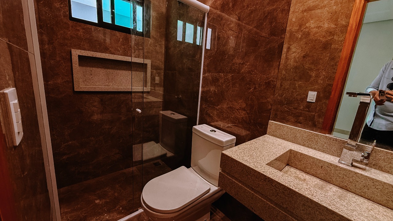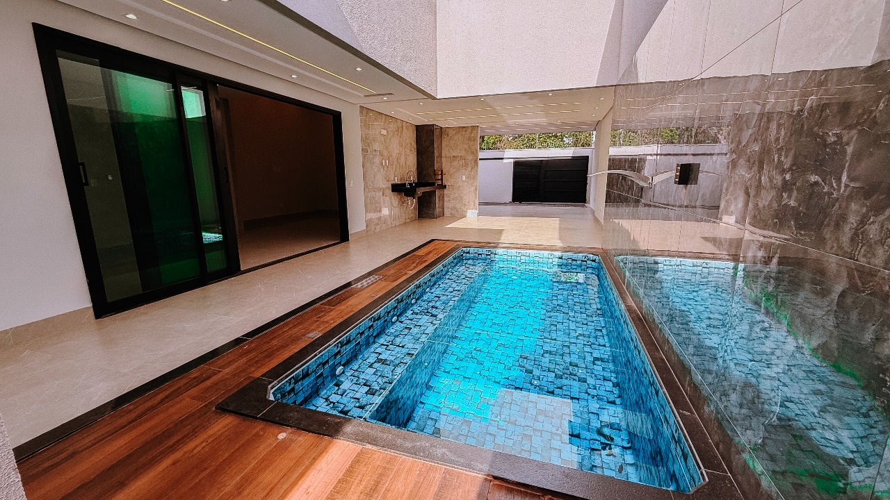 Na área externa, o lazer é completo, com piscina com cascata e aquecedor, ideal para momentos de lazer em qualquer época do ano. O imóvel possui poço artesiano e é todo na laje, reforçando a qualidade construtiva.
